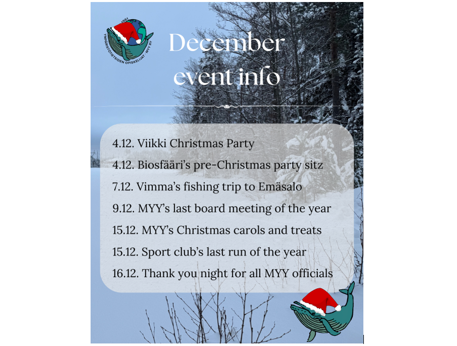 Tässä vuoden viimeiset tapahtumat kasattuna kuukausitiedotteeseen. Toivotan kaikille tsemppiä viimeiseen rutistukseen ennen lomaa!