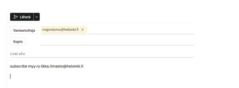 - Kirjoita viestiin: subscribe myy-ry oma.osoite@helsinki.fi